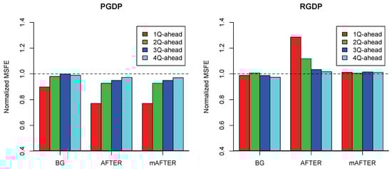 In Case 2, we set and for simplicity. The remaining simulation settings are the same as Case 1. The normalized average forecast risks (relative to SA) are summarized in Figure 2.