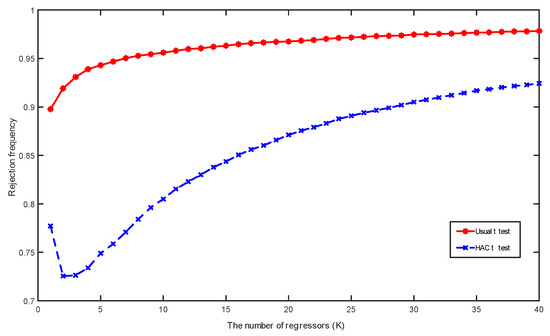 Is there a test which does not always indicate that coefficients are significant in the ‘spurious’ regression (6)? As the results of (Sun 2004) show, the answer is positive for the case where K is fixed. In this event, the HAR test is appealing in the sense that when and K is fixed, so that test size is controlled in the limit. Therefore, when appropriate critical values obtained from the limit distribution of are employed, the coefficients do not inevitably signal significance as and the usual misleading test implications of spurious regression do not manifest. However, in the important case where the regressor space expands and , the test statistic diverges to infinity at rate and the coefficients become significant again even under HAR testing.