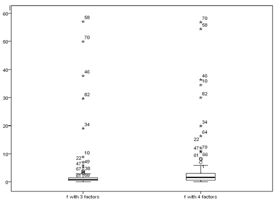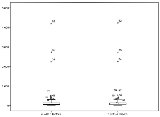 Compared with Figure 1, we get different orders of the outliers. For the factor score part, the most distinct outliers are the 58th, 70th and 46th. Figure 2 shows that, from the error part, the most distinct outliers are the 82nd, 58th and 34th, while the first three outliers in the classic MD are the 58th, 70th and 46th. By using this method, we distinguish the outliers from different parts of the factor model. It helps us to detect the source of outliers. In addition to the figures, we also implemented our model in other factor structures with different numbers of factors (5 and 6 factors). The results showed a similar pattern. The maximum stock returning rates are the same as the ones we found from the factor structure model with 3 or 4 factors. The reliability of the factor analysis on this data set has also been investigated and confirmed.