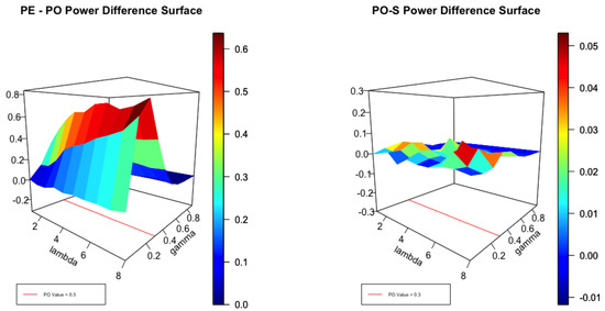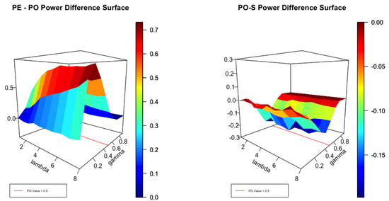 It is helpful to view Figure 1, Figure 2 and Figure 3 in the light of the cross sections displayed in Figure 4. It is clear that, for small values of , no test can be expected to perform well close to the null. Equally, for large values of , with high degrees of over-dispersion, all reasonable tests can be expected to be powerful. Thus, for small and large degrees of over-dispersion we expect to see little difference in the performance of the envelope and the test as the left panel of Figure 1 attests. For moderate values of , the power of the test can be significantly smaller than the envelope as the coloured scale suggests. In the left panel the difference in power between the and score tests is plotted for . The differences are not large but the test uniformly dominates as the scale indicates. Figure 2 plots the same surfaces for and the interesting feature is that both tests perform similarly but none dominates the other. In Figure 3, and the score test dominates by a small margin except where the corresponds to .