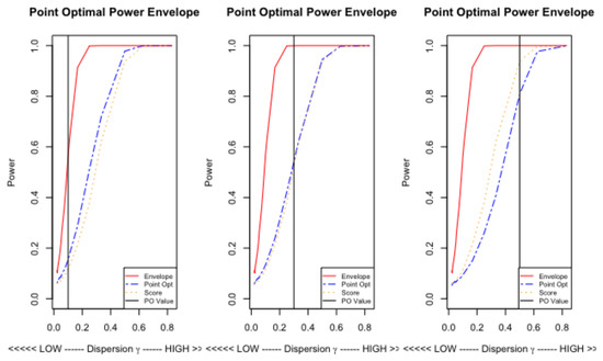 Point optimal tests have had a long and varied career in econometrics; see King (1987) and King and Sriananthakumar (2015) for an overview. These tests optimize power at a particular parameter value under the alternative, the idea being to have good power at a point where incorrectly accepting the null really matters. This is in contrast to, say, a score test that is locally best, in that it has the steepest power function local to the null hypothesis. Although not an undesireable property in any way, the practical difference between a null model and some other model local to the null is often, although not always, vanishingly small. So, optimizing the ability to distiguish between such null model and another local to it is not necessarily all that desireable a property. Moreover, there is implicit in such an approach the notion that the power function will be monotonically increasing, which ideally it should be, and that it will remain near the power envelope as the data generating process diverges from the null. In many cases this is indeed what happens, although we know that power functions are likely to cross, as otherwise the test would be uniformly most powerful, which is a very rare property indeed. The divergence between the power function of a score test and the power envelope is then something that requires exploration on a case by case basis and we will explore this below.