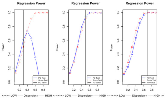The power envelope reaches unity at around . This corresponds to a degree of over-dispersion, in the distribution, of . For the tests to reach equivalent power requires with , roughly, and is required at . So, neither test can match the envelope unless the degree of over-dispersion is quite large. For less than the test performs better uniformly, at they perform equally well and for the score test is better. Thus, a choice of which is small will uniformly dominate.