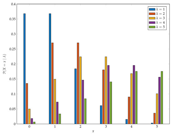 Figure 6 provides some insight into the sensitivity of Poisson pmfs to changes in parameter values when the parameters are small and includes examples that are variously skewed to the right, (roughly) symmetric, and skewed to the left. Observe that, here we have used as the base case and that, as increases, it is by one standard deviation each time and so these changes are quite dramatic.