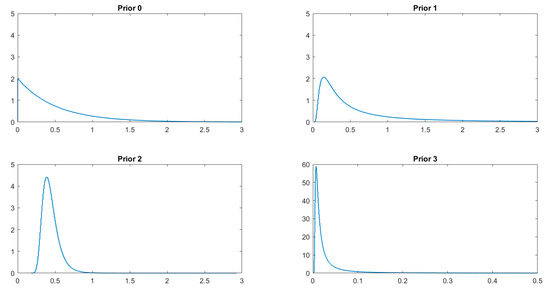 Figure 1 presents densities of the four priors on while Figure 2 and Table 1 show the resulting marginal priors on given models (i–iv). One can easily notice that prior 3 is very restrictive. Its interquartile range (IQR) is extremely narrow relative to other priors while also having the highest median (0.99) and mean (0.96–0.97). This means that prior 3 assumes very high (almost full) efficiency with very little room for variation. Changing N or Q to any of the values known in the literature does not have much of an influence on this result. So, from the viewpoint of prior elicitation of , prior 3 makes little sense in SFA. Moreover, although this is a very informative prior on —with most of its prior mass near zero—the distribution is still separated from it. Such separation from zero poses a dilemma as it can be viewed as penalization (through prior) of models which assume no inefficiency. A similar concern can be raised for prior 1 and especially for prior 2. Although they are far less restrictive and lead to reasonable marginal priors on , both priors on are well separated from zero, which again may favor SF models over non-SF ones in BMA. On the one hand, under prior 2 is positioned much further away from zero than in prior 1. On the other hand, prior 1 leads to marginal prior on with a rather significant amount of probability mass near zero; see Figure 2. That is, the resulting distribution of is somewhat U-shaped, which is not necessarily a desirable feature for an efficiency distribution.