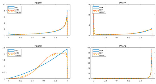 Although the focus of this paper is on NEX and NHN models—as these are the most likely to be used for BMA in practice—the other two models have two important features that we wish explore. First, NHG nests both NHN and NEX (GHG obviously does too). This allows us to meet the prior coherence task raised in Section 2 and see the implications different priors on may have. Second, GHG further generalizes NHG with respect to , which gives us a unique opportunity to analyze the interplay between shape and dispersion parameters of (more generalized) distributions of and . In particular, we are interested to learn, which of the two models—NEX, NHN—is more adequate given our data. We start the investigation by first exploring the general properties of the following priors on and the implications they carry for the marginal prior distribution of efficiency ():