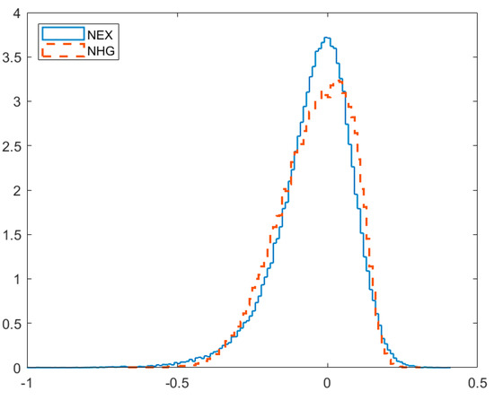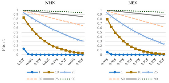 Posterior predictive density of for normal-exponential (NEX) and normal-half-GED (NHG) under prior 0.