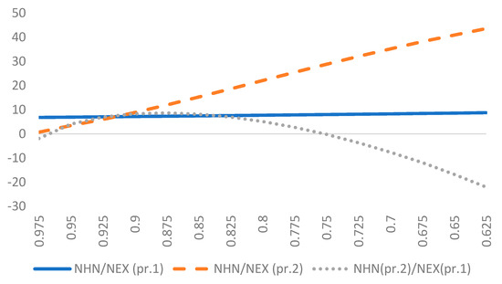 where , , and Table 7 shows four sets of BMA results—one for each prior case (0–3)—using three models: non-SF, NEX and NHN. For almost all cases SFA models have turned out to be a posteriori significantly less likely, which is to be expected. Only models based on prior 3 “keep” their posterior odds in relation to the prior. Again, this is also to be expected because, as noted in Section 3.1, prior 3 produces a very restrictive marginal prior on , which is “squeezed” to one (full efficiency case). So, no wonder these SF models look competitive to the “true” non-SF specification. Furthermore, posterior distributions of efficiency in all SF models are much more distorted than in the example from previous section and their locations do not seem to change much in relation to the priors (especially for prior 3; compare Table 1). This result is quite common and may be used as a simple warning signal for practitioners: if your model is either (i) significantly less likely compared to a non-SF counterpart; or (ii) has good posterior odds but its posterior distribution of efficiency largely replicates the prior (in terms of location and dispersion) then it is likely that information in the data does not warrant the use of SFA specification.