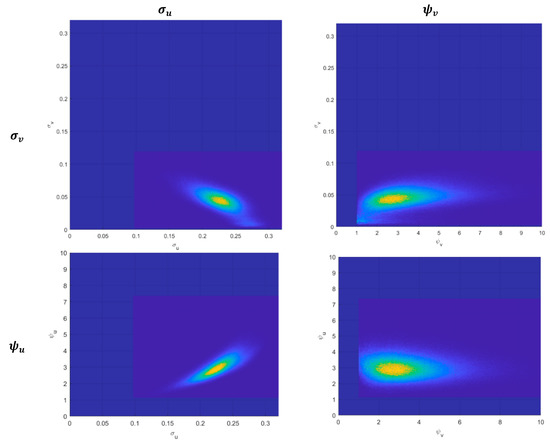 Bivariate marginal posterior densities for the stochastic structure parameters.