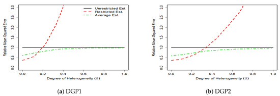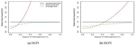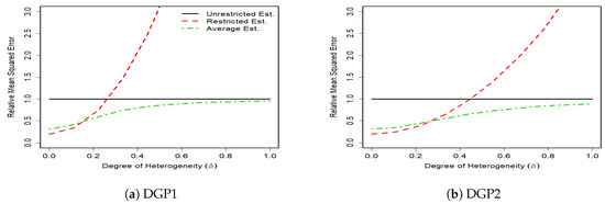 The results of 1000 monte carlo simulations are given in Figure 1, Figure 2, Figure 3 and Figure 4, where the vertical axes measure the relative mean squared error (RMSE) of the unrestricted GLS estimator, the restricted GLS estimator and the average estimator to the unrestricted GLS estimator. Hence, the RMSE of the unrestricted GLS estimator is equal to one. The horizontal axes measure the degree of parameter heterogeneity, , which is set between zero and one with grid value.