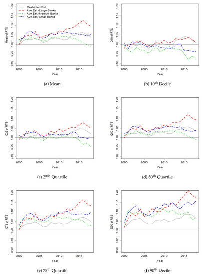 Comparing the RTS of banks using the average estimator over the sample period shows that, on average majority of banks have increasing returns to scale. In most recent years, the results exhibit more signs of cost efficiency for Large and Small banks, such that all of Large banks have increasing RTS and only less than 25% of Small banks have exhausted their cost efficiency. However, we find that more than 50% of Medium banks are operating under decreasing returns to scale near the end of the sample. The results are consistent with some recent studies (e.g., References Feng and Serletis 2009; Hughes and Mester 2013; Wheelock and Wilson 2001; Henderson et al. 2015; Mailkov et al. 2015) although we are not aware of any study from 2011 to 2018.