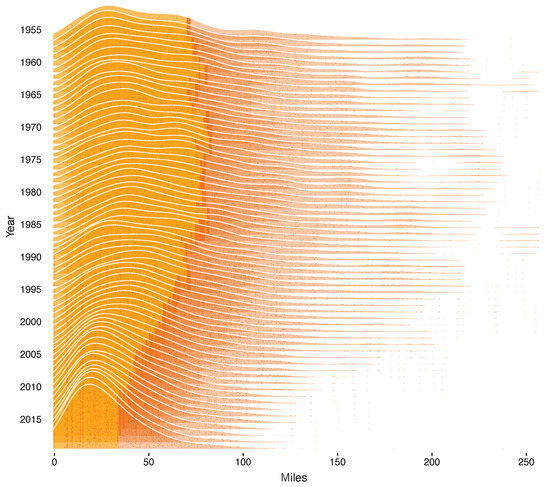 I start by computing the 12-h-ahead forecast errors from every tropical storm in the North Atlantic since 1954. This includes 14,641 forecast errors from 744 storms. Forecast errors are calculated as the distance between the actual track of the storm using Vincenty (1975)’s formula for the surface of a spheroid. Next, I estimate the time-varying forecast error densities for every year since 1955 using a rolling window of the past five years.2