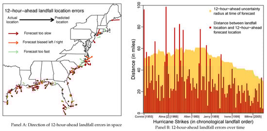 12-Hour-Ahead Hurricane Landfall Errors. Notes: Landfall errors are computed such that the forecast was made roughly 12 h before landfall. In panel A, the coloring is based on the angle of the forecast error. This is calculated from the distance between the forecast and actual location (shown), the distance between the location 12 h prior and the current locations, and the distance between the previously location and the forecast. Green: < 90 degrees; Orange > 90 degrees and < 135 degrees; Red: >135 degrees. In panel B, the uncertainty radius corresponds to the distance that captures 2/3 of all forecast errors in the five years prior to the year in which the strike occurred.