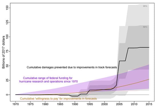 To assess the relative benefits, I compare the prediction against two different estimates of costs. The first is the range of cumulative costs of producing the forecasts and their improvements since 19709. After accounting for these costs, the predicted net savings is around $30–71 billion. The second measure of cost is the cumulative private willingness to pay for forecast improvements since 1970 as extrapolated from Katz and Lazo (2011). The benefits of forecast improvements are greater than both public spending and private willingness to pay for them. This suggests that both individuals and the U.S. federal government underestimate the value of improving hurricane forecasts. This estimate is a lower bound of the total net benefits from forecast improvements since fatalities prevented (Willoughby et al. 2007) and reduced evacuation and damage mitigation costs (Regnier 2008) are excluded.
