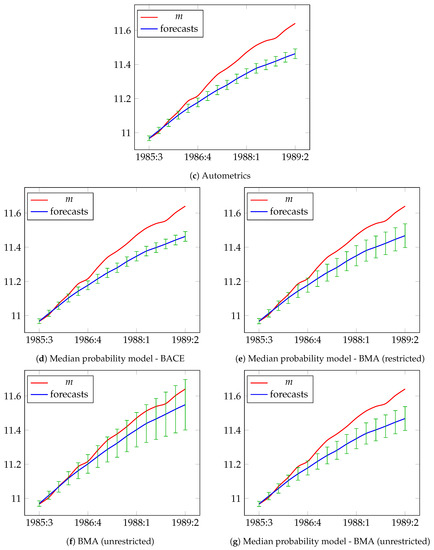 In the next step, we decided to compare the accuracy of forecasts. Table 5 presents the BACE, B A (with and without stationarity restriction) and Autometrics forecasts of nominal narrow money in the UK for the period from 1985:3 to 1989:2, which covers 16 quarters. The second column includes the logs of the actual values of the dependent variable. The next columns contain the weighted averages of individual model forecasts and errors for BACE, BMA, and Autometrics, respectively. Additionally, we include results for so-called median probability models introduced by Barbieri and Berger (2004). Moreover, the five bottom rows of the table contain well-known measures of forecast error: RMSE, MAPE, and Theil’s U coefficients.