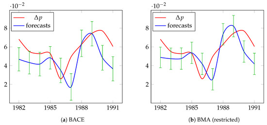 One potential explanation of this observation is that the forecasts in Autometrics and median probability models are generated by only one model. According to the BACE and BMA with stationarity restrictions results, the use of a single model leaves 98.5% and 91.9% of the total posterior probability mass. On the other hand, BACE and BMA calculates forecasts from the whole model space and accounts for the mixture of all considered specifications, which are weighted by their posterior probabilities.