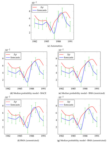 In this section, we analyze the BACE and BMA results for data used in two well-known dynamic macroeconometric models: model for M1 money demand in UK (UKM1), which was proposed in Hendry and Ericsson (1991), and the long-term UK inflation model, as introduced in Hendry (2001). We focus on the modeling and forecasting of narrow money and inflation in the UK using the BACE and BMA methods along with the Autometrics program6. We analyze the estimation results using standard posterior characteristics, such as posterior inclusion probabilities, the posterior means of regression parameters, and the posterior standard deviations, as defined in Section 2. We compare forecasting accuracies using three measures, namely, root-mean-square error (RMSE), mean average percentage error (MAPE), and Theil’s U coefficient (see Theil 1966, pp. 33–36) divided into three factors: bias proportion UM (measures differences between averages of actual and predicted values), regression proportion UR (evaluates the slope coefficient from a regression of changes in actual values on changes in predicted values), and disturbance proportion UD (measures proportion of forecast error associated with random disturbance). Two first factors stand for systematic error and should be 0, while disturbance proportion is an unsystematic element and should equal 1.