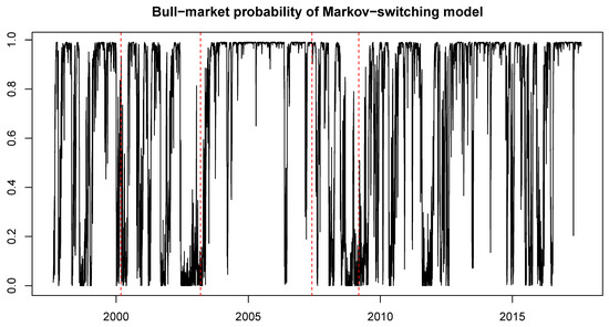 with . Here is a Markov chain with transition probabilities and . For identification purposes, we assume and call regime one the “bull market regime”. When the model is applied to the Eurostoxx returns, we observe that the bull market regime is associated with a positive mean whereas the bear market regime has a negative mean of and a larger standard deviation than that of the bull market. Both regimes are persistent, but the average bear market is shorter than the average bull market since the probability to remain in a bear market is smaller. The probability of a bull market at time t conditional on the observations up to time t is depicted in Figure 2. Even though the nowcast does not result in the same sharp borders as the other approach, it still confirms the pattern.