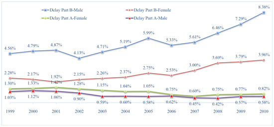 Proportion of individuals who delay Medicare in a given year. This figure shows the evolution of the proportion of Medicare enrollees who delay Medicare Part A or Medicare Part B from 1999–2010, broken down by gender. Authors’ calculation using data from the pooled 1999–2010 MCBS Cost and Use files, using cross-sectional sample weights.