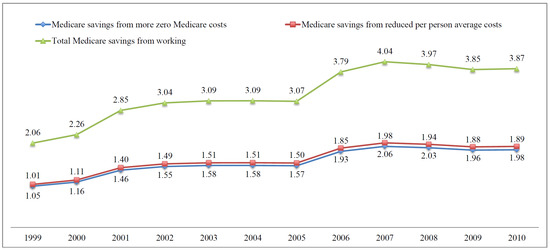 Using our empirical findings, we calculate that, over the 1999–2010 period, the annual Medicare savings resulting from the fact that around 4.58 million older Americans keep working after age 65, are $3.25 billion. The annual savings amount from MSP for around 1.23 million Americans is around $1.04 billion. Finally, the annual savings from the joint effect of working and MSP for around 0.80 million Americans amount to around $1.08 billion. Most of the changes in these savings over time are linked to increases in the age-eligible Medicare population, and increases in their labor force participation.
