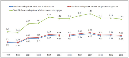 Annual Medicare cost savings from MSP. The figure shows the annual Medicare cost savings from MSP, in billions of dollars, from 1999–2010. The green line (total Medicare savings from Medicare as secondary payer) is the sum of the blue (Medicare savings from more zero Medicare costs) and red (Medicare savings from reduced per person average costs) lines. Authors’ calculation using the estimation results shown in Table 2 and Table 3, and statistics from Table 8.