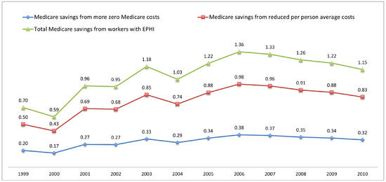 Annual Medicare cost savings from workers with EPHI. This figure shows the annual Medicare cost savings from workers covered by EPHI, in billions of dollars, from 1999–2010. The green line (total Medicare savings from workers with EPHI) is the sum of the blue (Medicare savings from more zero Medicare costs) and red (Medicare savings from reduced per person average costs) lines. Authors’ calculation using the estimation results shown in Table 2 and Table 3, and statistics from Table 8.