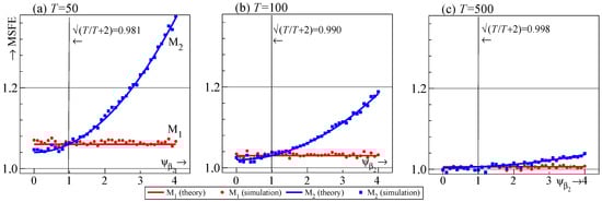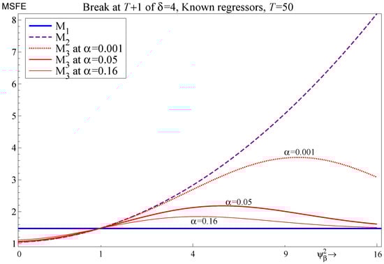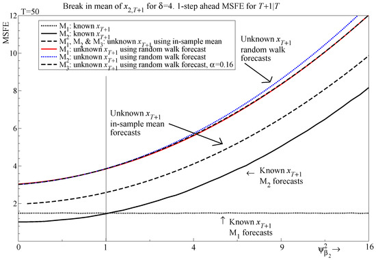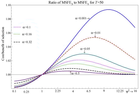 - For the two-regressor case, maps to . Selection delivers improvements to the one-step-ahead MSFE for and can be close to the correct model specification for , with the largest deviations occurring at intermediate values of .
