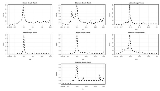 In this work, seven cryptocurrencies were used: Bitcoin, Ethereum, Lithium, Stellar, Ripple, Dashcoin, and Dogecoin. All the quotes for these series were collected from the Yahoo Finance site. The sample period is from June 2016 up to December 2020 for 1671 daily observations. The additional low-frequency volatility determinant is the Google trend series for each cryptocurrency. These Google trend series are reported monthly and enter Equation (12) as the first difference. The patterns of the cryptocurrencies and Google trend prices are illustrated in Figure 1 and Figure 2, respectively. In line with the literature, the connection between online searches and the prices’ movements appears evident. As of January 2018, all the online searches present a peak. Correspondingly, all the prices observed in January 2018 are at their maximum.