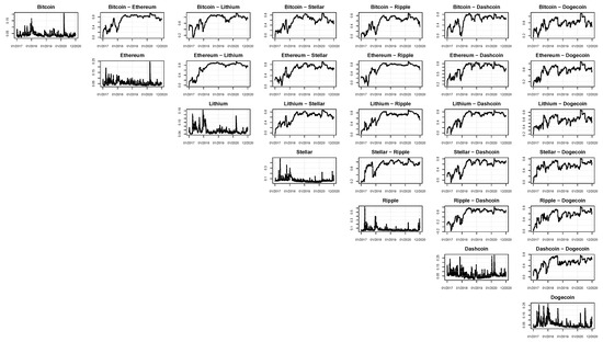A graphical analysis of the correlation plots of the models belonging to the SSM (according to Euclidean and Squared Frobenius loss functions) is fundamental to visualize the time-varying patterns of the estimated correlations. Figure 4, Figure 5 and Figure 6 are dedicated to these plots, respectively, for models M4 (DAGM + cDCC), M5 (DAGM + DCC-MIDAS), and M6 (DAGM + DECO). Independently of the model adopted for the correlations, all the cryptocurrencies appear to be highly correlated. In particular, if the correlations seem low at the beginning of the considered sample, during the last period the digital currencies exhibit larger and generally very high interdependencies, almost always ranging between 0.6 and 0.8. From a portfolio manager’s perspective, these interconnections are fundamental to deciding the assets in which to invest.