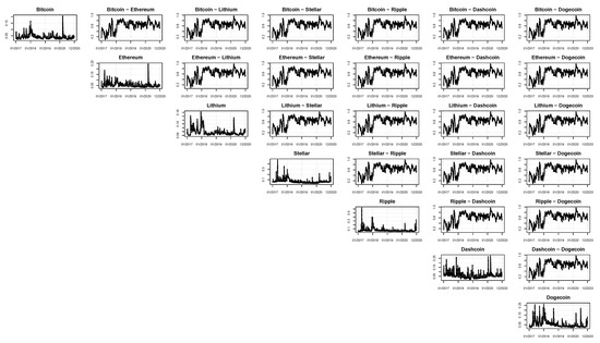 Recently, the literature has also been interested in the interdependencies among cryptocurrencies and other financial assets. For instance, Cebrián-Hernández and Jiménez-Rodríguez (2021) used the Dynamic Conditional Correlation (DCC) model of Engle (2002) on a mixed portfolio composed of Bitcoin and ten other assets. Mensi et al. (2020) applied the DCC model to four cryptocurrencies (Bitcoin, Ethereum, Litecoin, and Ripple). Katsiampa et al. (2019) applied the Diagonal BEKK (Engle and Kroner 1995) and its asymmetric version to eight cryptocurrencies. Using a multivariate factor stochastic volatility model in a Bayesian framework, Shi et al. (2020) investigated the dynamic correlations among six cryptocurrencies. García-Medina and Chaudary (2020) studied the interconnections of cryptocurrencies in a network context by estimating the multivariate transfer entropy. Ji et al. (2019) investigated the volatility spillovers among six cryptocurrencies, finding that Bitcoin and Litecoin played a prominent role.