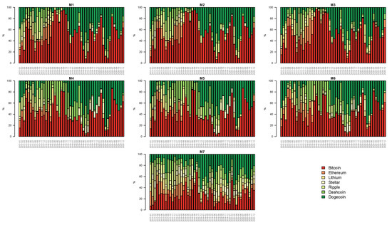 where is the conditional mean of the portfolio, is the portfolio standard deviation, and is the inverse of Student’s t cumulative density function with degrees of freedom. Note that in Equation (15), we use a Student’s t distribution to explicitly take into account the fat tails of the cryptocurrencies. Finally, each VaR series coming from models M1 to M7 is evaluated through the MCS procedure using the following quantile loss (), as in González-Rivera et al. (2004):