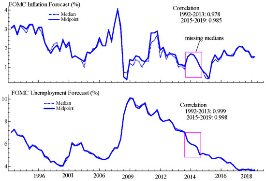 Data for the median of the distribution of participants’ inflation and unemployment forecasts involve combining information from the immediate and delayed releases. Data for 1992–2012 are computed using the participants’ forecasts from delayed releases (Table 4). Data for the median of forecasts from 2015:Q3 to 2019:Q3 are available from the immediate releases (Table 4). Data from 2013:Q1 to 2015:Q2, however, are not currently available from existing releases. Thus, the paper examines whether the midpoints of the forecasts’ range for 2013:Q1 to 2015:Q2 (always available) offer a suitable substitute for the missing values of the median. Figure 2 reveals that movements in the median and the midpoint from FOMC forecasts are closely associated with each other.