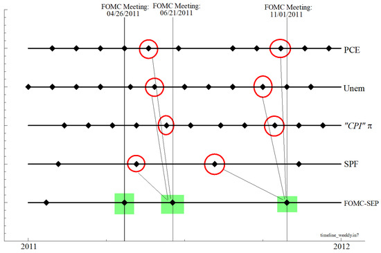 Timeline of releases of public data. Each horizontal line shows the release dates for the selected variable. The red circles denote the date of the variable used; the green square corresponds to the Greenbook.