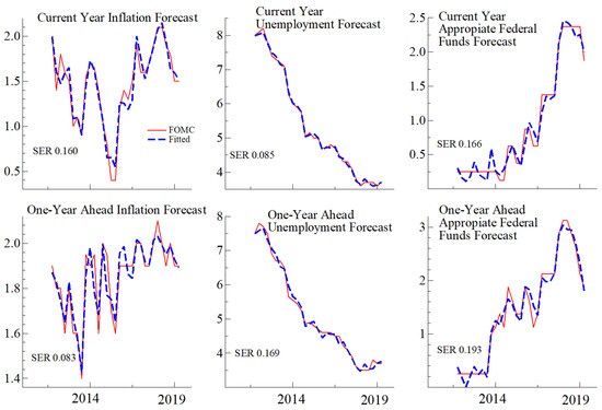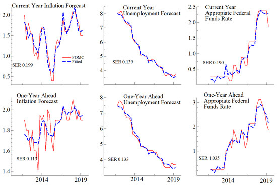 The results from Table 8 and Table 9, when considered as a whole, reveal empirically reliable and economically meaningful models explaining the median of the projected appropriate rate. Further, the estimates are quite close (though not identical) to the ones assumed in the Taylor rule. These findings have shortcomings. First, the SEP’s projections for these variables are, arguably, jointly determined. In other words, there might be value in jointly forecasting the FOMC forecasts for inflation, unemployment, and the appropriate interest rate. Second, each participant forecasts at multiple horizons. Those forecasts may be jointly determined and so may be affected by periodic extensions of the horizon by the FOMC.
