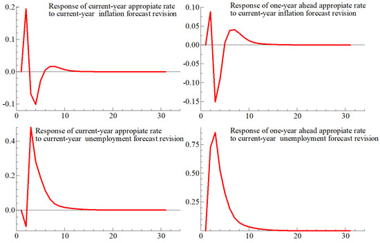 - Figure 11 shows that a transitory, one percentage point upward revision in ( see Equations (6) and (7)) raises by 40 basis points and by 80 basis points in the unrestricted VAR. These increases contradict existing macroeconomic theory, the Taylor rule, and the empirical results shown in the single-equation estimation results reported above. Therefore, the unrestricted VAR developed here is not consistent with the macroeconomic theory underlying the dual mandate. Applying the same forecast revision to the restricted VAR shows that decreases by 40 basis points and that decreases by nearly 50 basis points. These decreases are consistent with the macroeconomic theory that underlies the Fed’s dual mandate. Thus, only the restricted VAR satisfies and