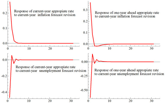 A central feature of the FOMC forecasting protocol is the opportunity for participants to revise their forecasts for a given target date. Indeed, FOMC participants may issue as many as 12 forecasts for each target date (Table 3). Thus, and following Bernanke’s suggestion of reporting alternative scenarios (see page 8), Figure 10 and Figure 11 report impulse responses to revisions in inflation and unemployment forecasts. These responses are consistent with macroeconomic theory if and :