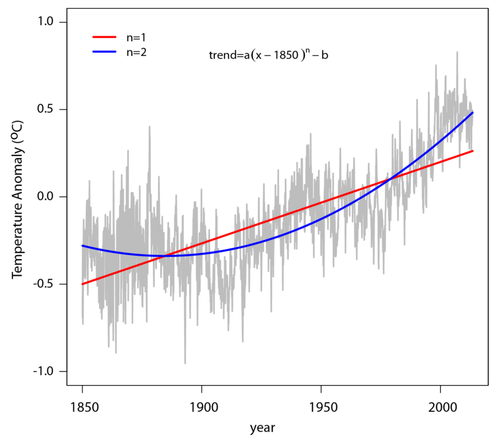 Our conclusion that a linear fit is inappropriate is reinforced by Figure 5 from [4]. That figure shows a callout box that superimposes a low quality linear approximation to actual temperature information (HADCRUT4), as in our Figure 1. The linear-fit conclusion is also contradicted by Figure 1 in [4], which shows a series of linear trend line fits to temperature data, extending back to approximately 1860. In the legend of the figure, the more recent trend line slopes are more positive which reflect a faster temperature increase in recent decades as opposed to a constant linear trend.