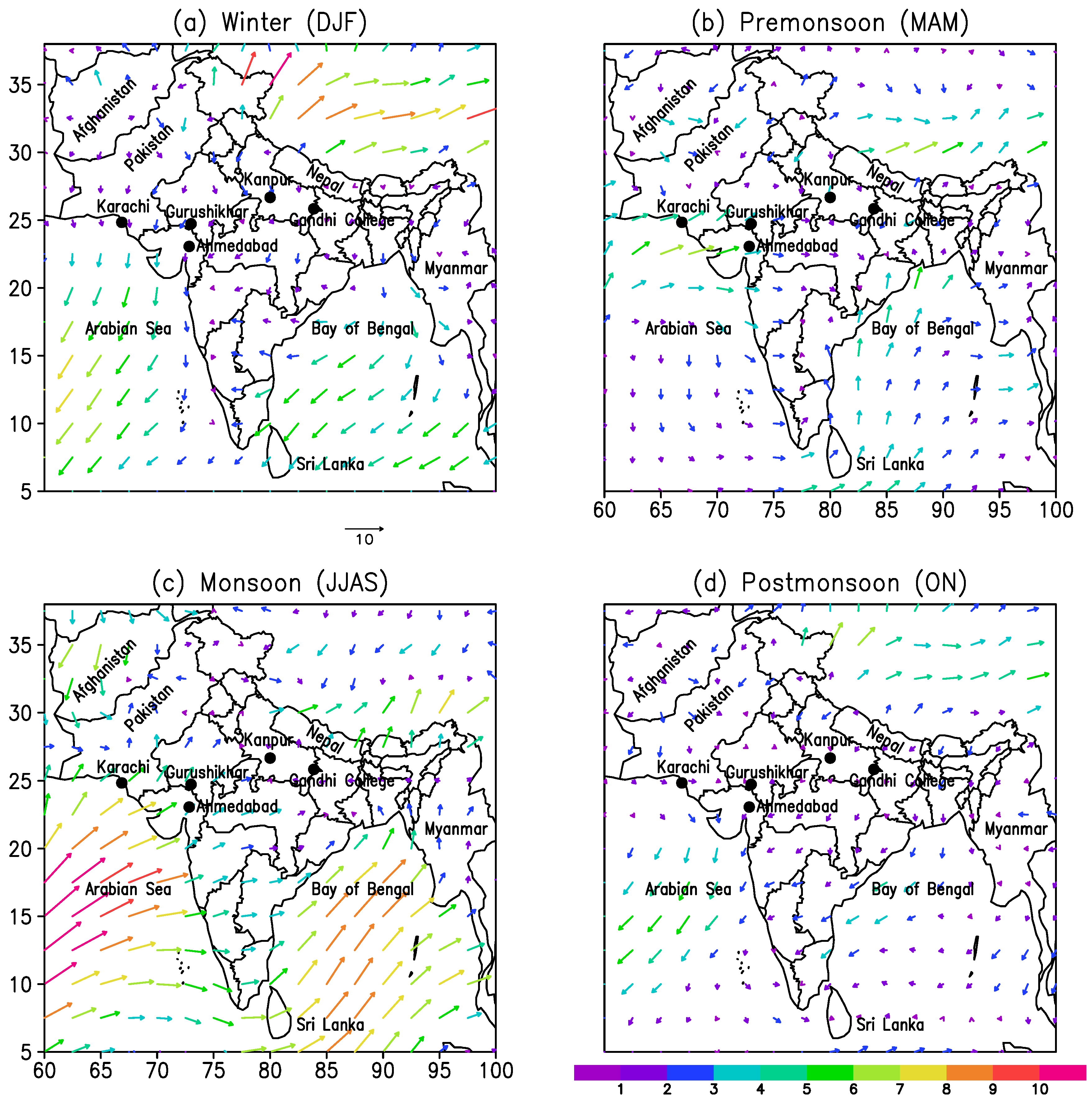 Figure 7) at all the locations except Gurushikhar. AODs in Ahmedabad are about a factor of two higher than Gurushikhar. AODs in the Indo-Gangetic Plain are higher than that of Ahmedabad, while Karachi AODs are comparable. Higher AODs at lower wavelengths indicate the abundance of smaller size particles. During postmonsoon and winter the boundary layer is shallow and holds the pollutants in a smaller volume near the Earth’s surface when compared to summer. Over the Indian subcontinent the dust activity is found to peak in the spring (March-May) which decreases in summer with the onset of southwest monsoon [