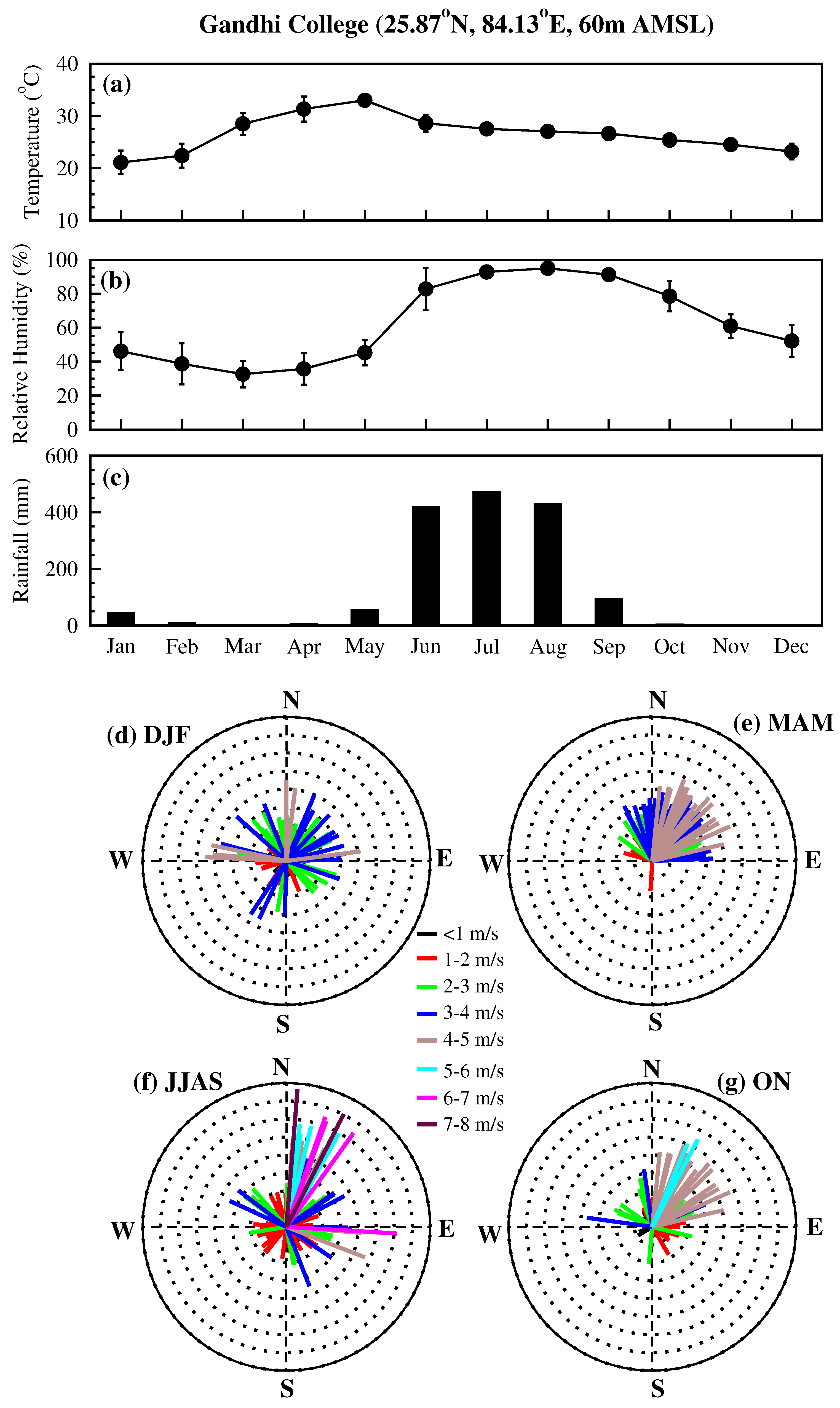 27] as seen here. Gandhi College being a rural, downwind location south of Kanpur exhibits similar features as that of Kanpur. Higher AODs during postmonsoon and winter is a characteristic feature of the locations in Indo-Gangetic basin. Over much of northern India the temperatures are colder in the winter. During postmonsoon and winter the boundary layer is shallow and holds the pollutants in a smaller volume, when compared to summer, which results in confinement of aerosols. The colder temperatures along with the trapping of pollutants give rise to hazy and foggy conditions over Indo-Gangetic basin [