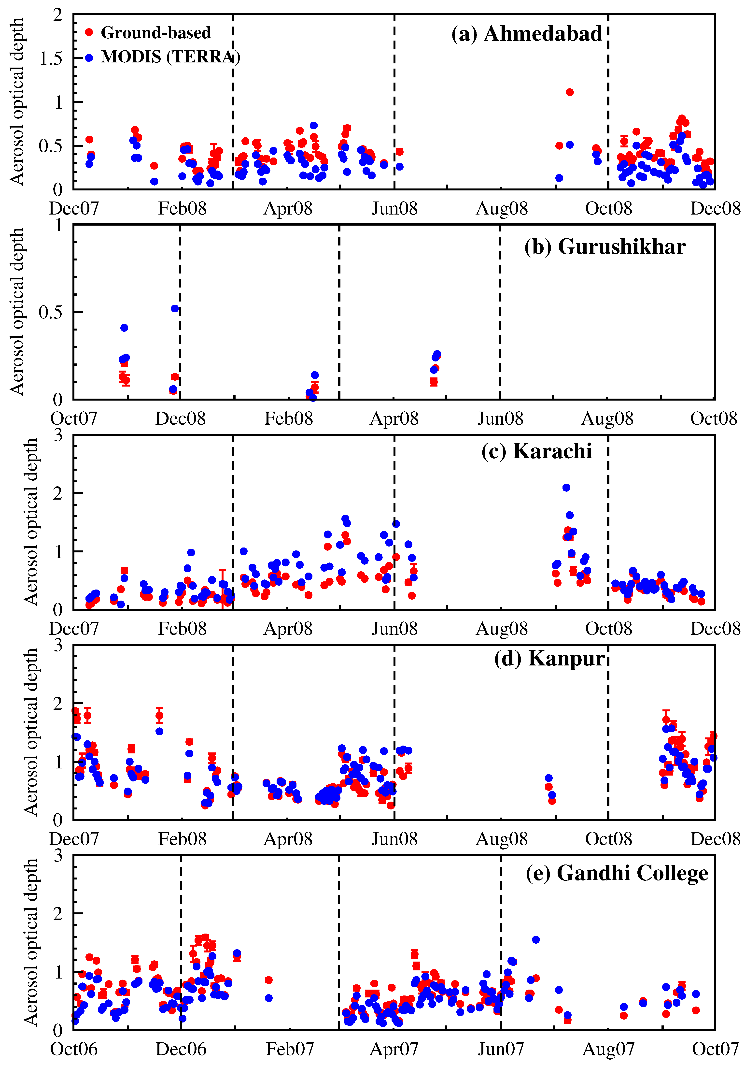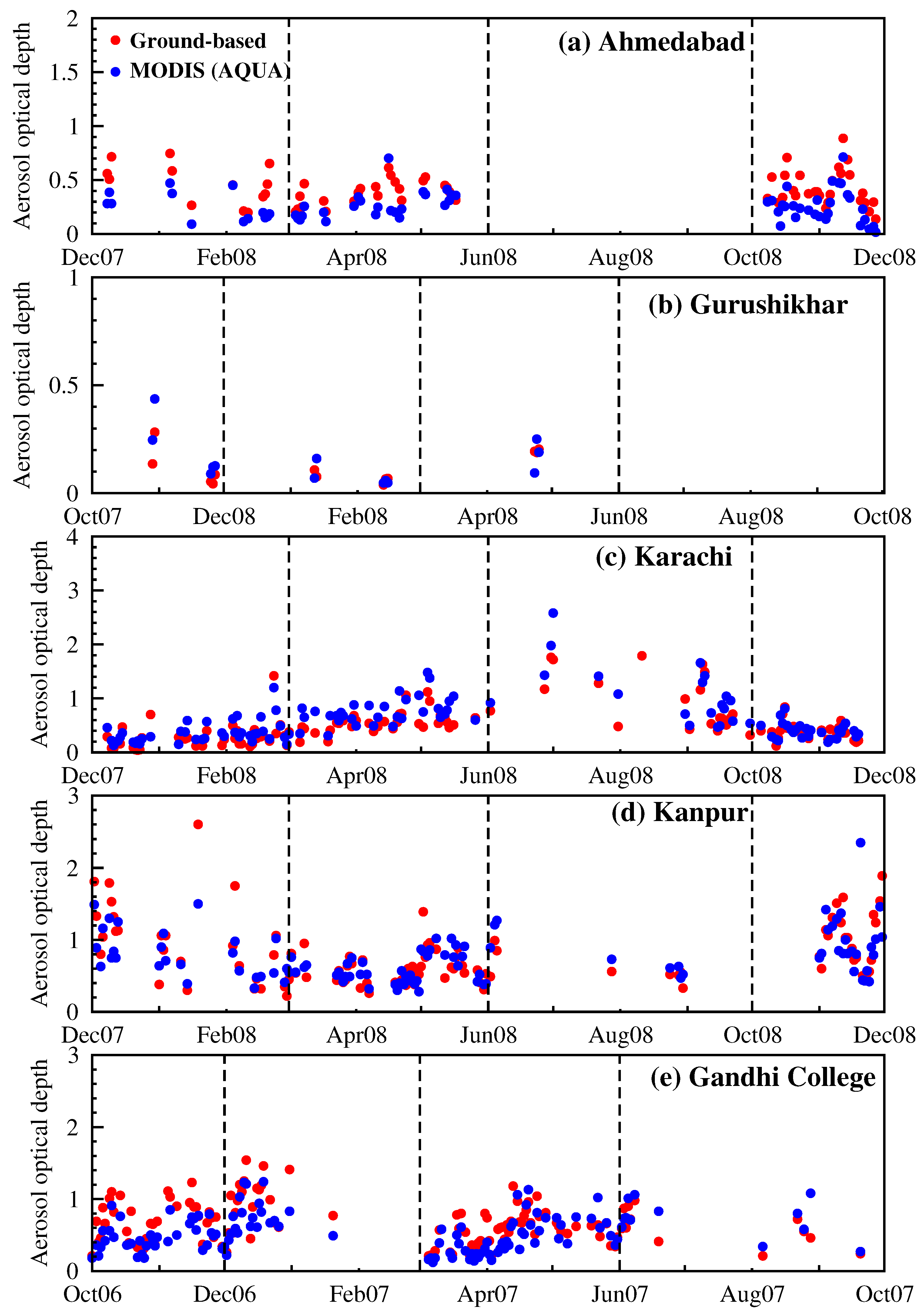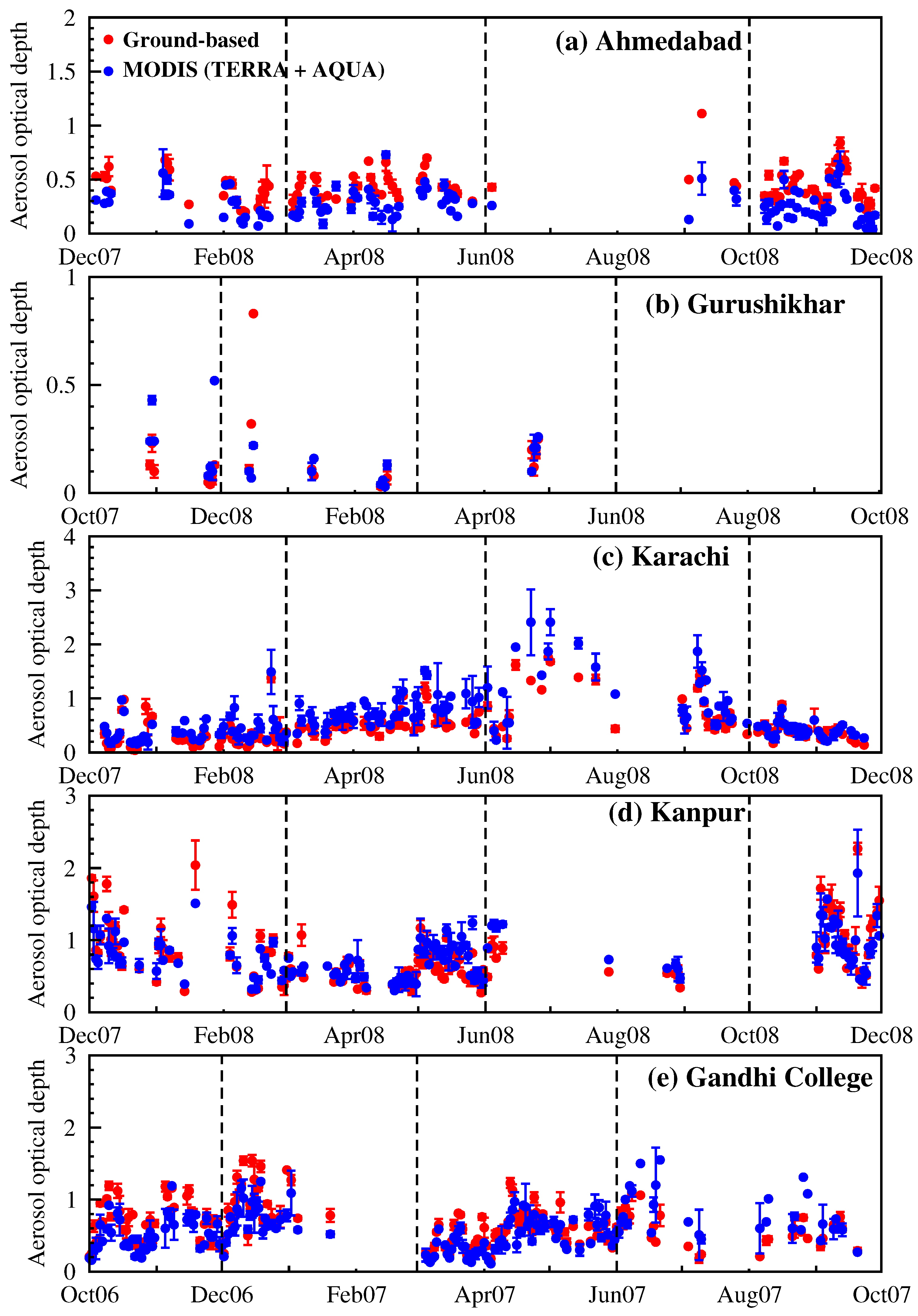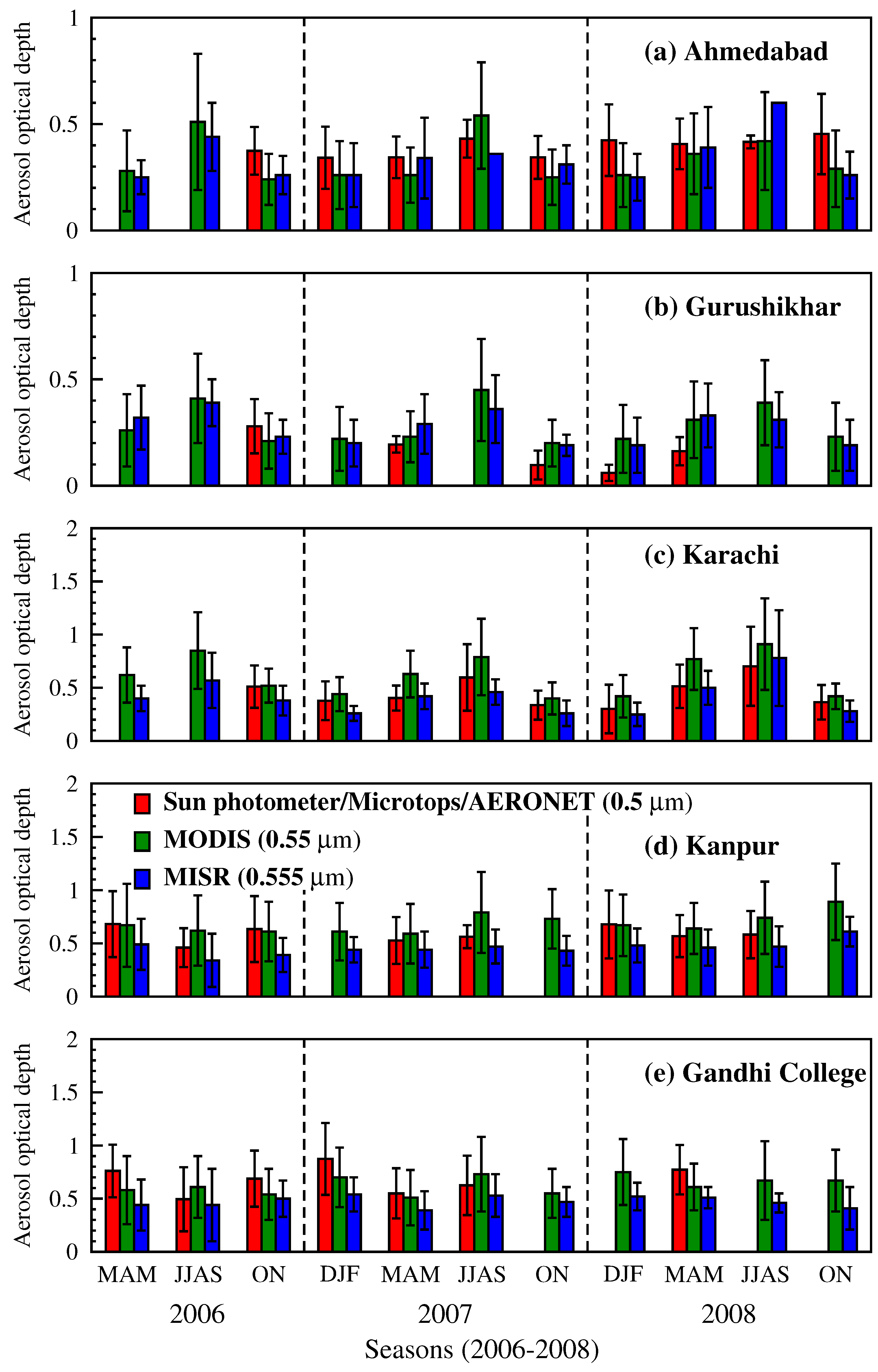 Figure 14), for example, the winter and postmonsoon low in AODs and the premonsoon and monsoon high in AODs. However, the magnitude of AODs are found to exhibit distinct behavior. MODIS underestimates AODs in Ahmedabad, Gurushikhar and Gandhi College by at least 0.04 in absolute magnitude, while it overestimates by about 0.06 in Kanpur and by 0.13 in Karachi. On the other hand, MISR underestimates AODs at all the locations except Gandhi College (