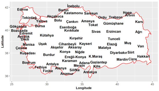 Türkiye with complex topography is located on two continents, Europe and Asia. The Northeast part of Türkiye is in Europe and the main part of the country is located in Asia. Türkiye is surrounded by the Black Sea to the north, the Aegean Sea from the west and the Mediterranean from the south. Thus, beach tourism is popular and contributes to the Turkish economy [25].Due to the diversity in landforms of Türkiye, it is a good destination for other forms of tourism like skiing or mountain tourism. The focus of the study is to investigate the climate conditions and their contribution to the suitability for tourism activities. The monthly mean of daily maximum temperature (°C), daily mean temperature (°C), daily minimum relative humidity (%), daily mean relative humidity (%), daily sunshine duration (hours), daily mean wind speed (m/s) and monthly sum of daily total precipitation (mm) data are used for TCI calculation, and these are obtained from the Turkish State Meteorological Service (TSMS) for the period of 1981–2020. The raw data includes more than 200 stations. The stations with the data availability of precipitation less than 80% is excluded, so 98 stations are used in this study. The location of the stations used in this study is seen in Figure 1. The altitudes and coordinates of the stations are given in Table 1. The spatial and temporal analysis was stratified by season (December, January, and February for winter; March, April, and May for spring; June, July, and August for summer; and September, October, and November for autumn).