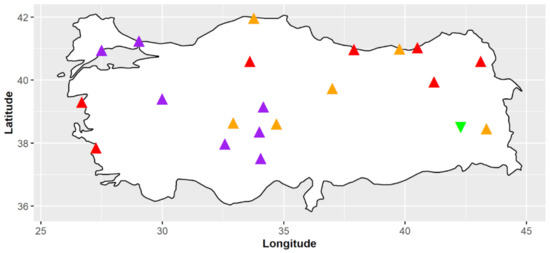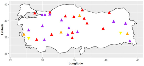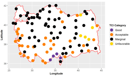The TCI distribution of the stations in December is seen in Figure A1 and Table 2. The TCI values range between 35 and 64. There are four stations from the East and Southeast Anatolia Region that have TCI values lower than 40. There are six stations along the shoreline of the Mediterranean and south part of Aegean Region have TCI values greater than 60, that stands for the “Good” category. The rest of the stations have TCI values between 40 and 60. Figure A2 and Table 2 shows the TCI distribution for January. The minimum and maximum TCI values are 30 and 59, respectively. The vast majority of the East Anatolian Region and Rize, The Hopa and Zonguldak stations from the Black Sea coastline have TCI values smaller than 40 that corresponds to “Unfavorable” conditions. Stations in the Aegean and Mediterranean coastline region have TCI values greater than 50 (“Acceptable”). The remaining stations have TCI values that are categorized as “Marginal”. TCI values increase slowly in February over those of January, as in Figure A3 and Table 2. The TCI values range between 32 and 65. There are four stations from the East Anatolia Region with TCI values lower than 40. There are eight stations from the Mediterranean coastline that have TCI values greater than 60 which corresponds to “Good” conditions. The other stations have TCI values between 40 and 60. The TCI values increase from north to south.