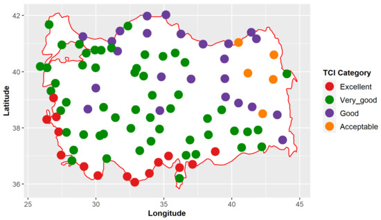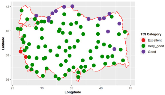 The TCI distribution across Türkiye in spring is seen in Figure 3 and Table 2. The increasing pattern of TCI values from north to the south is clearer. A decreasing pattern from west to the east due to increasing elevation is also clear. TCI values decrease from “Very good” to the “Good” category by moving Central Anatolia to the East Anatolia Region. There is a decrease from “Very good” to the “Acceptable” category in a few hundred kilometers to the increasing elevation. The lowest TCI values are seen in a few stations in the East Anatolia Region. In spring, all the stations have a TCI value greater than 50 that corresponds to the categories better than “Acceptable”. Tatvan has the smallest TCI value of 53. Rize, Erzurum, Kars and Agri have TCI values less than 60. Out of 98 stations, 24 have TCI values in the “Good” category and 54 of 98 stations have TCI values in the “Very good” category. Additionally, 15 of 98 stations have TCI values between 80 and 90, corresponding to the “Excellent” category. Silifke and Mersin are the stations with the highest TCI values of 85 and 84, respectively. Finike and Fethiye have TCI values of 82.