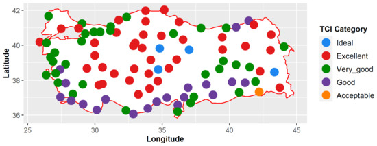 For September, the TCI distribution for the stations in the study is shown in Figure A10 and Table 2. The TCI values are increasing during September. The values range between 63 in İskenderun and 94 in Van and Hakkari. Seven stations are in the “Good” category, 28 in the “Very good” and 45 in the “Excellent” category. Also, 18 stations are in the “Ideal” category, the highest number in the ideal category across all months. The TCI distribution pattern is slightly more complex than other warm months. The higher values are in the inner regions, but lower TCI values are observed in both the Black Sea and on the Mediterranean coast. TCI distribution in October is seen in Figure A11 and Table 2. The minimum TCI value of 62 is observed in Tatvan in the East Anatolia Region and a maximum TCI value of 87 is observed in Kuşadasıon the Aegean coast. Additionally, 11 stations have TCI values in the “Good” category, 43 are in the “Very good” and 44 stations are in the “Excellent” category. In general, inner parts of the country have greater TCI values than the Black Sea Region. In November, TCI values decrease for the whole country as seen in Figure A12 and Table 2. The TCI values range between 43 and 77. The East Anatolia Region, Black Sea Region except Samsun Station, Thrace region of Türkiye and the vast majority of inner-Anatolia have TCI values smaller than 60. The Mediterranean Region, Aegean Region and Southeast Anatolia Region have TCI values greater than 60.