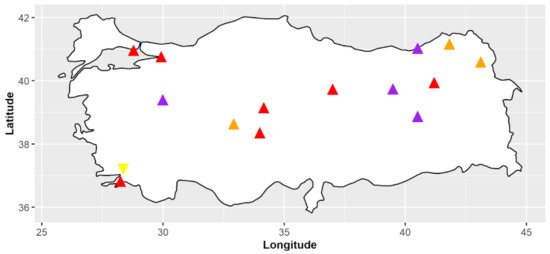 Figure A13 and Table 3 show the trend analysis results of TCI values for December. Only 10 stations have statistically significant trends in TCI values. The remaining stations have no statistically significant trends in TCI values for December. There are five stations that have increasing trends in TCI values at the 10% significance level. In addition, the number of stations which have increasing trends at the 5% and 1% significance levels are three and one, respectively. On the other hand, only one station (Sinop) has a decreasing trend in TCI values for December. According to the test results, the Marmaris station, which is in the Aegean Region, and the Bingol station, which is located in Eastern Anatolia Region, have higher increase amounts.