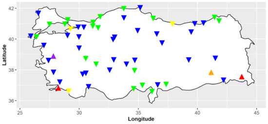 Figure 6 and Table 3 show the trend analysis results of TCI values for winter. As seen in Figure 6, 14 stations have an increasing trend for the winter period. On the other hand, only one station (Muğla) which is in the southwestern part of Türkiye has a decreasing trend with 10% of significance level. In addition, the remaining stations have no statistically significant trend in TCI values for winter. There are seven out of 14 stations that have an increasing trend at the 10% significance level while four of them are at the 5% significance level. In addition, three stations have a decreasing trend at the 1% significance level. According to the test statistics, the Kars station, which is located in the Eastern Anatolia Region, and the Cihanbeyli station, which is located in the Central Anatolian Region, have higher increase amounts.