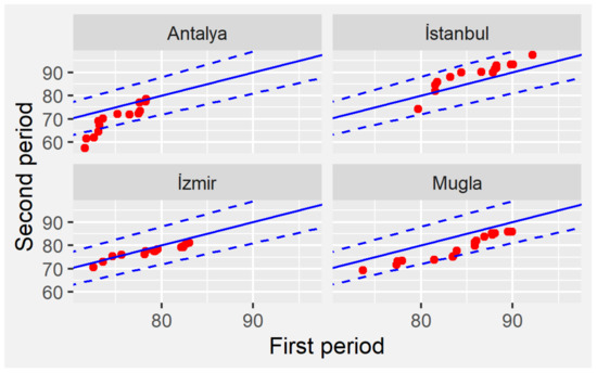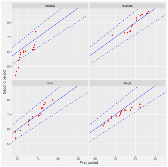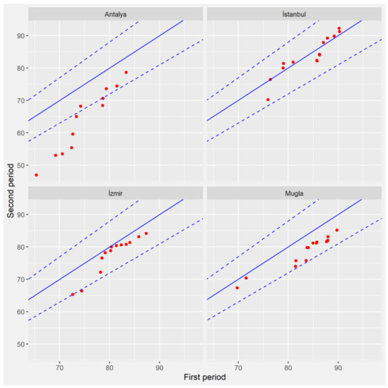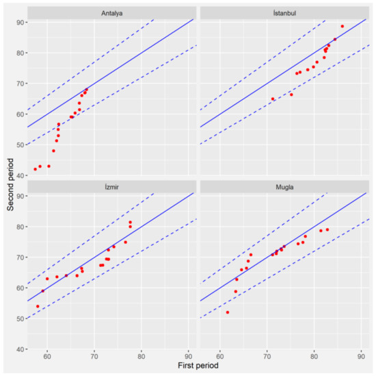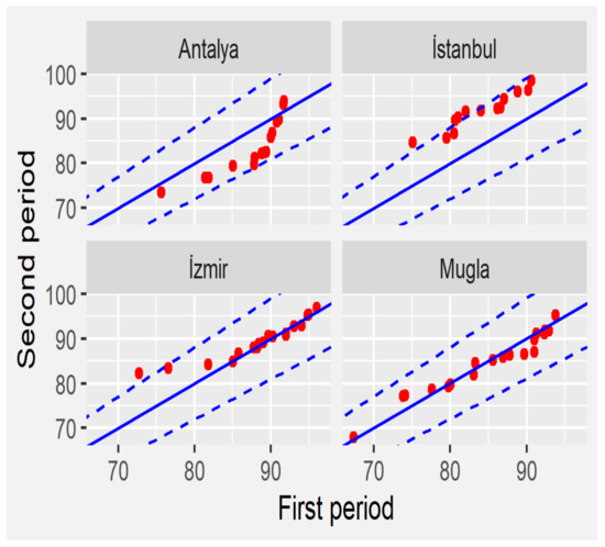 The scatter plots of July TCI values for famous destinations are seen in Figure 12. As seen in the figure, Antalya has a decreasing trend for all values except the highest. Small values are located far apart from the x = 1.1y line. The remaining values are in between 1–1 line x = 1.1y line. The TCI values of Istanbul are located around the y = 1.1 line. The smallest value is in the increasing trend region while other small values are in the decreasing trend region. The medium and high values are in an increasing trend line. İzmir has a decreasing trend for small TCI values, a mixed trend for medium values and an increasing trend for high values. No values were observed out of the y = 1.1x or x = 1.1y line. For Mugla, almost all small and medium TCI pairs are in decreasing trend regions, not far apart from the 1-1 line. High values also fall into decreasing trend lines with increasing magnitude of the trend and reach the x = 1.1y line.