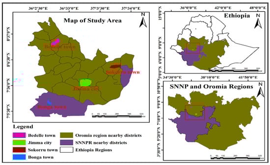 This study was conducted in southwest Ethiopia’s urban settlements, including Jimma, Bedelle, Bonga, and Sokorru, which lie between 7°22′ N to 8°45′ N and 36°23′ E to 37°40′ E, representing a grid box of 1° × 1°, as depicted in Figure 1. Within this region, the altitude ranges from over 2000 m in the high plateaus to 600 m in the flat low-lying plains. Climatically, southwestern Ethiopia has a temperate-type climate with annual temperature and rainfall ranging between 14 and 20 °C and 1700 and 2000 mm, respectively [55]. The study area is characterized by a mono-modal rainy season, which extends from March through mid-November, and also includes the location of one of the country’s rainfall maxima [55,56]. The current city administration of the urban centers is structured from the town level to kebeles, with decentralized functions of a municipality at the Kebele level (the lowest administrative body in Ethiopia). The total population of Jimma City was 120,600 in 2007, which is projected to be over 265,000 by 2024 with diverse ethnic compositions in the city; the total population of Bonga Town was 20,858 in 2007, projected to be 44,046 by 2024; the total population of Bedelle Town was 19,517 in 2007, projected to reach 40,500 in the year 2024; and Sokorru Town’s total population was 6233 in 2007, projected to be 25,617 by 2024 [56,57]. Each of the four towns included in this study has its own historical establishment, land-use types, structural plan, or master plan to guide development, while none of them was established in the planned way at the beginning.