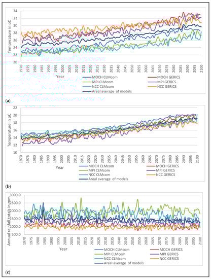 The computed performance of multi-model ensemble means for maximum temperature showed that the MOCH GERICS and NCC GERICS are above the average whereas MPI CLMcom and NCC CLMcom are below the average. The best models with the best fit within the average model ensemble range are MOCH CLMcom and MPI GERICS (Figure 2a). Likewise, for minimum temperature, the mean values for the models MOCH GERICS and NCC CLMcom are above the average whereas the MPI GERICS and NCC GERICS ensemble means are below the average. The best models with the best fit within the average model ensemble range are MOCH CLMcom and MPI CLMcom (Figure 2b). Regarding precipitation, models such as MPI CLMcom, MPI GERICS, NCC CLMcom, and NCC GERICS were simulated to be above the average values. Alternatively, MOCH CLMcom and MOCH GERICS are among the best model fits, with values within the average (Figure 2c). Overall, the multi-model ensemble means’ trend analysis showed that temperature (minimum and maximum) increased, but the minimum temperature has increased more than the maximum temperature. However, the precipitation trend is inconclusive: even though most models indicate a decreasing trend, a few models project an increasing trend in precipitation.