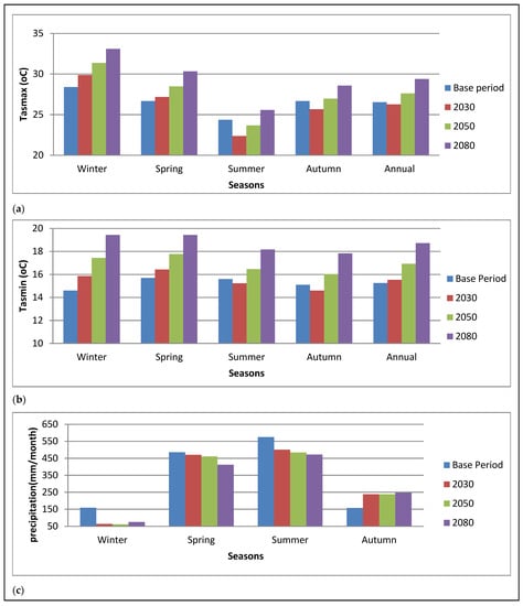 Projected (a) seasonal maximum temperature, (b) seasonal minimum temperature, and (c) seasonal precipitation under RCP8.5, as computed for the near-term (2030), mid-term (2050), and long-term (2080) with reference to the historical base period (1971–2005).