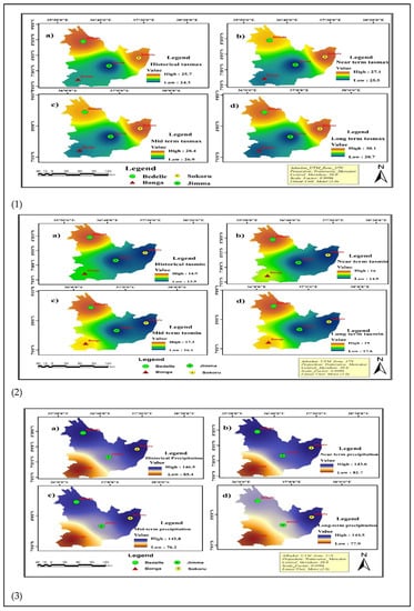 (Panel 1): (a) historical, (b) near-term (2030), (c) mid-term (2050), and (d) long-term (2080) maximum temperatures (°C); (Panel 2): (a) historical, (b) near-term (2030), (c) mid-term (2050), and (d) long-term (2080) minimum temperatures (°C); and (Panel 3): (a) historical, (b) near-term (2030), (c) mid-term (2050), and (d) long-term (2080) monthly mean precipitation (mm/month) for the four stations, as interpolated using Inverse Distance Weighing (IDW) using ArcGIS.
